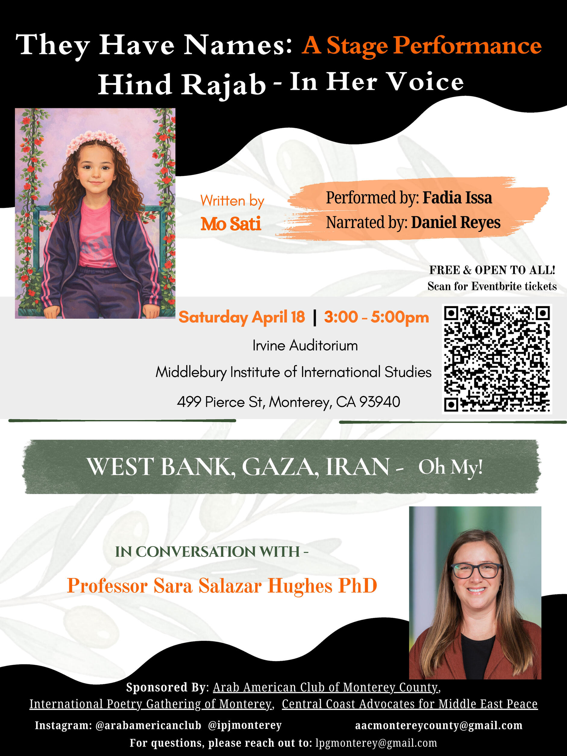 This is a poetic stage play and guided conversation exploring memory, voice, and the lived realities of Palestine.Hind Rajab: In Her Voice is a poetic stage performance- a ritual act of witness and remembrance honoring Hind Rajab, a six-year-old Palestinian girl killed in Gaza in 2024. The performance does not retell events. It does not reenact. It moves as ritual- built from childhood memory, poetic testimony, and sacred silence. Her voice emerges through fragments: moments of play, tenderness, fear, and hope. Everyday details become acts of resistance. The intimacy of a room. The language of family. The texture of a morning. As the arc deepens, language sharpens, moving from innocence toward insistence. The audience is not asked to watch what happened. They are asked to witness. To carry her name and the lives of nearly twenty thousand children killed in Gaza- as demand.Following the performance is an intimate conversation with Professor Sara Salazar Hughes, scholar of colonialism and occupation of Palestine, openning a wider examination of the realities of colonization in the West Bank and greater Palestine. We will explore the structures behind it, the mentality that drives it, and the Palestinian cost resulting from it.The segment concludes with an open Q&A.For questions, feel free to email [email protected].Sponsored By: Arab American Club of Monterey County, International Poetry Gathering of Monterey, and Central Coast Advocates for Middle East Peace